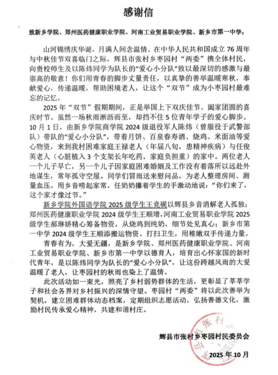 近日,英国上市公司365收到一封来自辉县市张村乡枣园村民委员会的感谢信。信中,村委会携全体村民,对以英国上市公司3652025级外国语言文学类3班王竞砚为代表的“爱心小分队”在“双节”期间的暖心善举致以崇高敬意,字里行间满是对学子们用青春担当传递温暖的认可与感激,也让学院“立德树人”的育人成果再次得到生动印证。